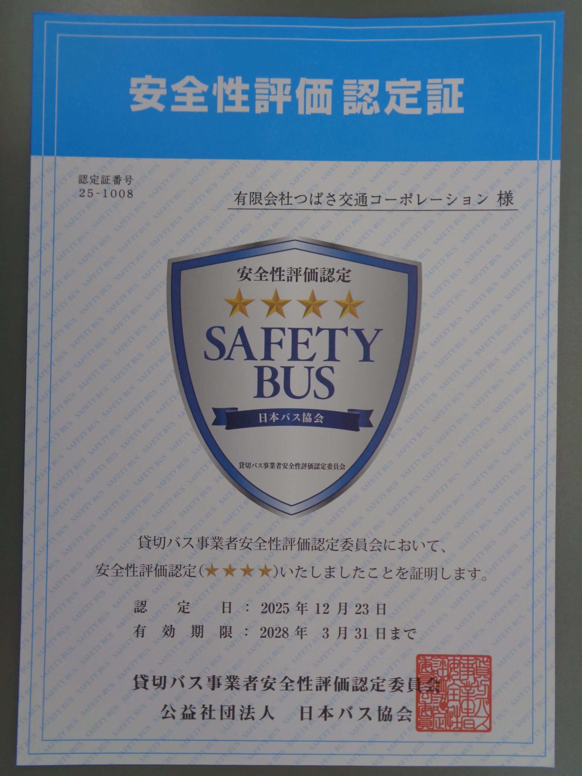この度、貸切バス事業者安全性評価認定四つ星の認定をいただきました。